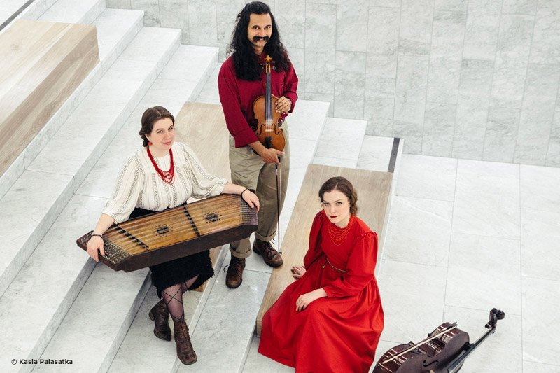 The premiere performance in Germany of Kapela Kotra, a brilliant young Vilnius-based trio that brings together the distinct yet kindred worlds of klezmer music and Belarusian traditional folklore. The trio is made up of Belarusian folklorists Alena Kandyba (cello) and Katsiaryna Hil (tsimbl) and Australian klezmer violinist Morgan Maruthiah.